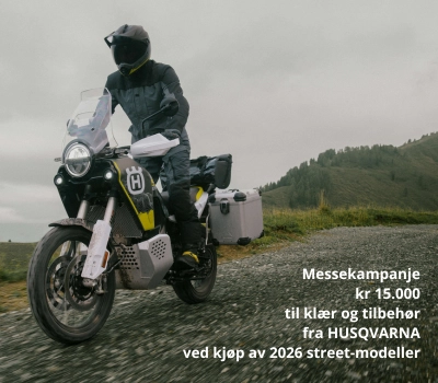 Husqvarna har flere kjempetilbud til deg som går i tanker om å kjøpe ny motorsykkel. Signerer du avtale på ny motorsykkel av oss i perioden fredag 27 februar – søndag 1 mars, så får du hele 15.000kr til å bruke på Husqvarna klær og tilbehør. Dette tilbudet gjelder alle 2026 street-modeller. Spør oss om finansiering.